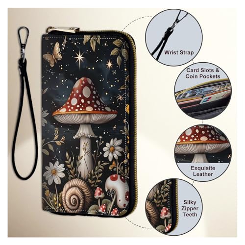 Wristlet Wallet for Women Teen Girls Womens Wallet RFID Blocking Credit Card Holder with Removable Wristlet,Leather Phone Wallet Clutch Large Capacity Ladies Travel Purs,Mushroom and Butterfliy 1