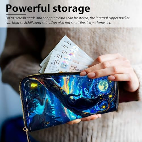 More information about Women's Card Holder Wristlet Wallet, Convenient Travel Long Wallet with Strap and Pink Compact Mirror, Fashion and Sturdy Wristlet Long Purse for Women, Starry Night Cat