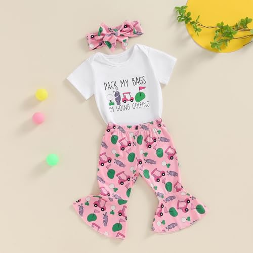Newborn Baby Girl Golf Outfit Letters Short Sleeve Romper Golf Cart Bell Bottoms 3Pcs Set Infant Summer Clothes 6