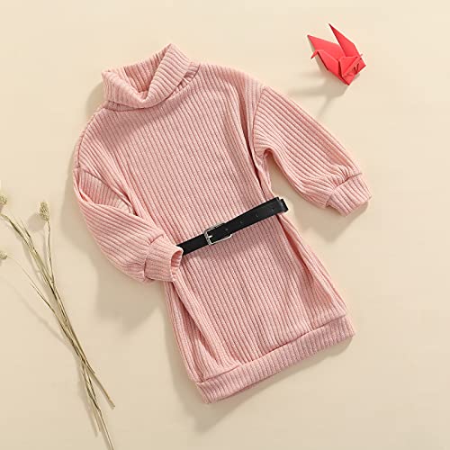 GOOCHEER Toddler Baby Girl Outfits Turtleneck Knit Sweater Dress Kids Solid Ribbed Long Sleeve Dresses +Belt Fall Clothes 4