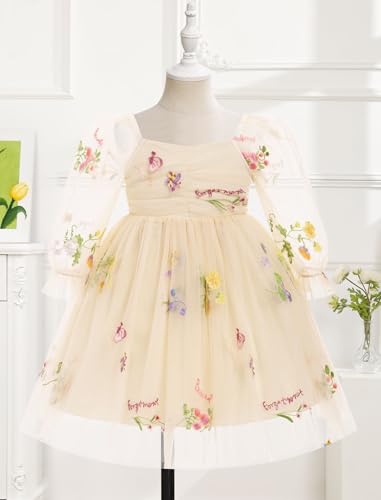 • Kids girls first birthday party dress flower girls christening dress princess pageant floral embroidery tutu dress. Sheer mesh top with puffy long sleeves and square neck, pleated mesh on the front, elastic ruched back, adds a fashionable and graceful feeling to the whole look. Tons of colorful polka dots, a classic element, show your girl's beauty and cuteness.