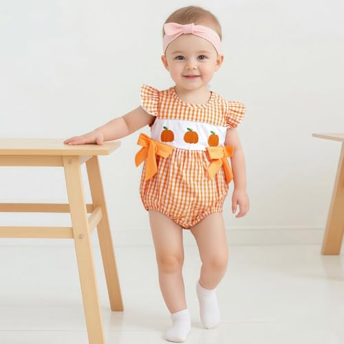 More information about My First Halloween Baby Girl Outfit Newborn Pumpkin Patch Romper Short Sleeve Doll Collar Smocked Plaid Bubble Romper