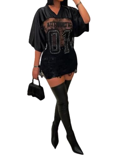 HOT ! Women's Plus Size Letter Print Lace Sheer Jersey Shirt Half Sleeve V-Neck Oversized Lace Jersey Top
