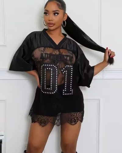 Women's Plus Size Letter Print Lace Sheer Jersey Shirt Half Sleeve V-Neck Oversized Lace Jersey Top 6