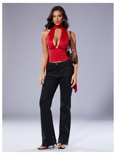 HOT ! SOLY HUX Sexy Tops for Women Going Out Halter Scarf Crop Top Deep V Sleeveless Backless Vest Party Clubwear