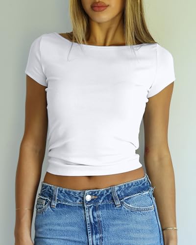 Beumissy Women's Boat Neck Short Sleeve T-Shirts Y2K Cute Going Out Tops Summer Baby Tees 2
