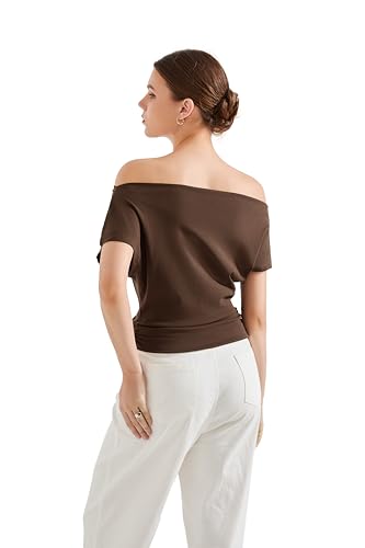 SUUKSESS Women Off The Shoulder Summer Tops One Shoulder T Shirt Casual Short Sleeve Boat Neck Tees 4