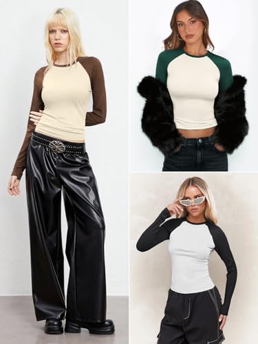 ATHMILE Womens Short Sleeve/Long Sleeve Cropped Tops Slim Fit Stretchy Color Block Slightly Shirts Y2k Fashion Clothes 4