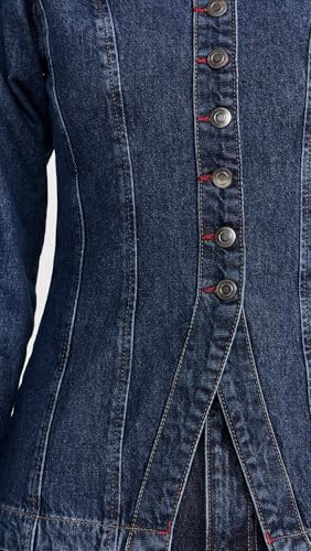 • COLLARLESS DEMIN JACKET - Long-Sleeve Denim Jacket showcases a fitted shape thanks to the seamed detailing, while a high V-neckline and contrasting red stitching around the buttonholes complete the look