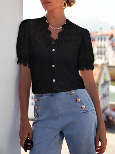 Women Lace Tops Summer V Neck Dressy Casual Button Down Blouses Ruffle Short Sleeve Business Work Shirts 6