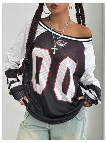 HOT ! SHENHE Women's Oversized Mesh Jersey Shirt Y2k Long Sleeve Off Shoulder Graphic Tee Top