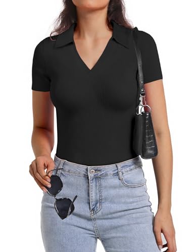 HOT ! Polo Shirts for Women, Short Sleeve Business Casual Tops, V Neck Polo Collared Work Shirts, Ribbed Fitted Shirts
