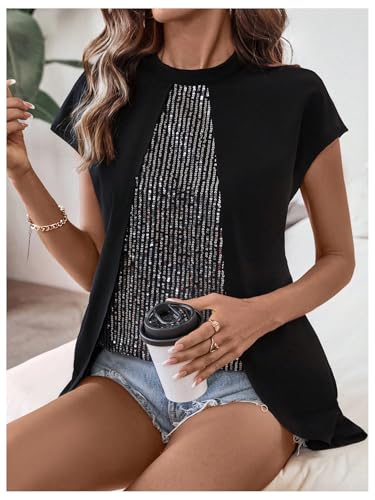 HOT ! SweatyRocks Women's Sparkly Sequin Blouse Crew Neck Short Sleeve Asymmetrical Party Tops