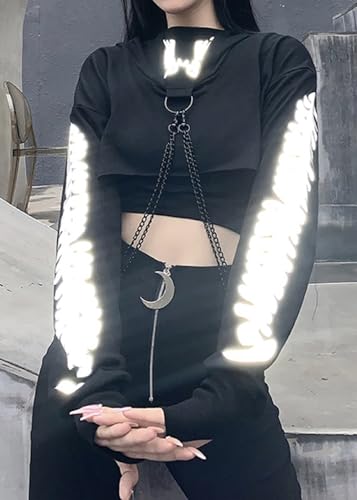 HOT ! TSMNZMU Womens Gothic Cropped Hoodie Long Sleeve Punk Grunge Skull Print Sweatshirt Emo Alt Mall Goth Tops with Iron Chain