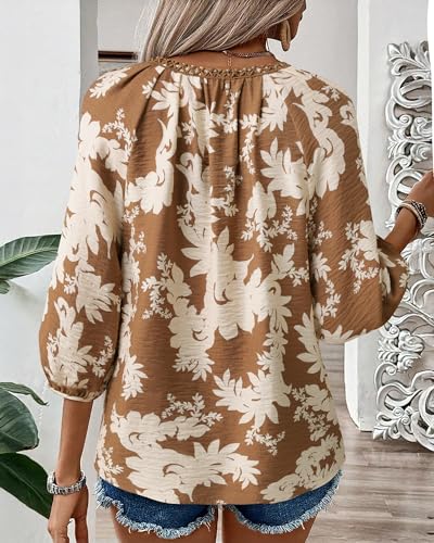 Gaharu Women's 3/4 Sleeve Boho Tops Casual V Neck Floral Print Loose Fit Blouses Tunic 3