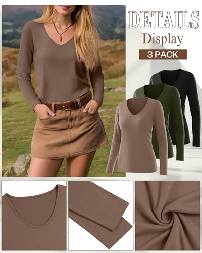 Ficerd 3 Pack Women's Long Sleeve T Shirts, V Neck Basic Tops Fall Casual Trendy Tees Loose Fit Soft Clothes Outfits 6