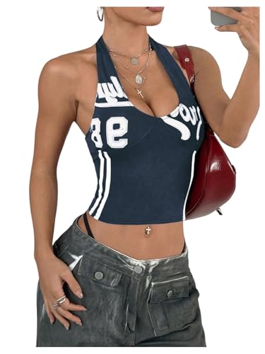 More information about Milumia Women Graphic Jersey Shirts Backless Halter Top Sexy Deep V Neck Sleeveless Crop Tops Streetwear