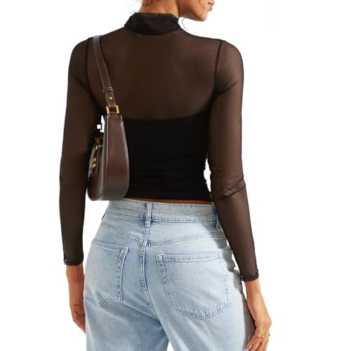 SUUKSESS Women Double Line Mesh Sheer Crop Tank Tops Mock Neck Long Sleeve Shirts 1
