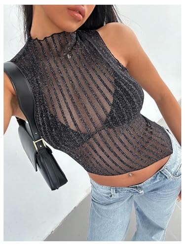 • Feature: Striped Print, Glitter, Lettuce Trim, Mock Neck, Sleeveless, Asymmetrical Hem, Slim Fit, Sheer Mesh Tank Tops for Women