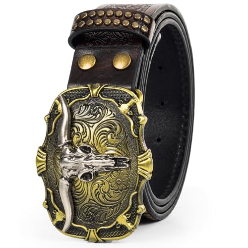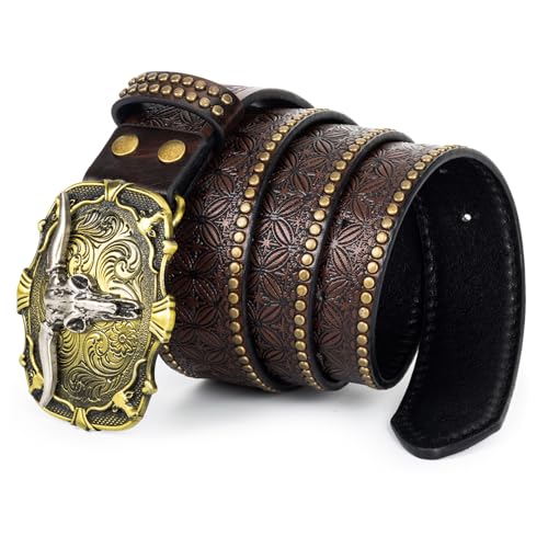 UTOWO Men Dark-Brown Casual-Belt Bronze-Buckle Western-Cowboy-Belt Country-Rodeo Skull-Longhorn Jeans-Acc for 32-40 In Waist 1