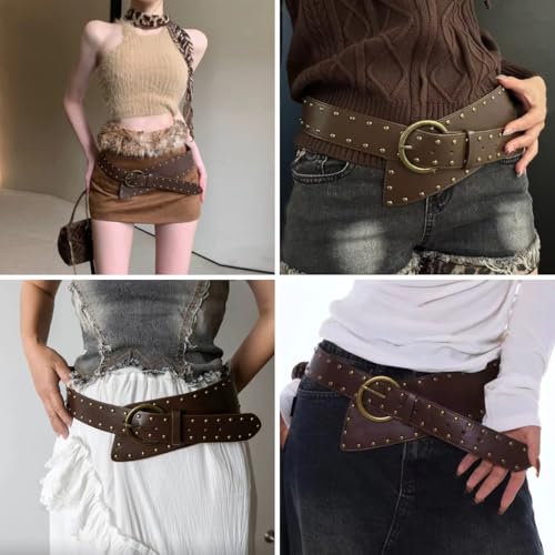 HOT ! AIBEARTY Women's Vintage Rivet Wide Buckle Belt Punk Gothic Western Cowboy Leather Y2K Waistband for Dresses