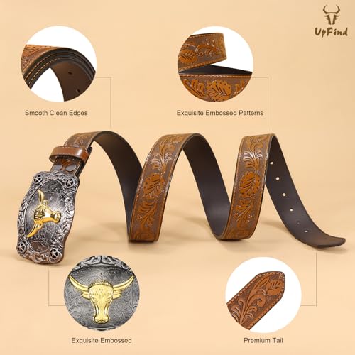 Women Men Western Belts Engraved Leather Cowgirl Cowboy Belt with Silver Longhorn Bull Buckle for Jeans Dresses 6