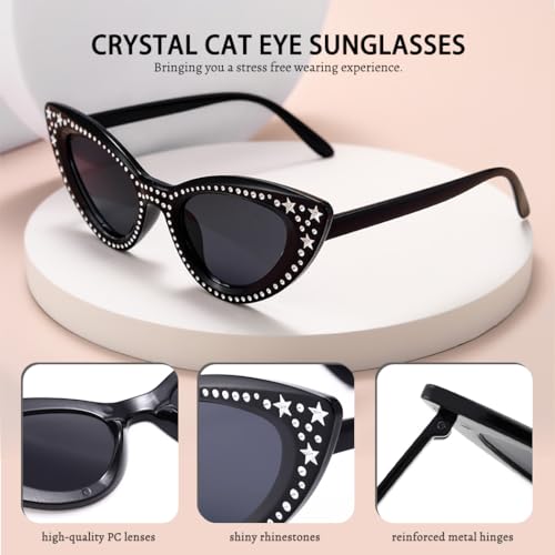 • Super fun crystal cateye sunglasses for women, black frame embedded with sparkle clear rhinestones made of high-quality PC lenses,reinforced metal hinges, light and comfortable,Integrated nose pad design can bring you a stress-free wearing experience.