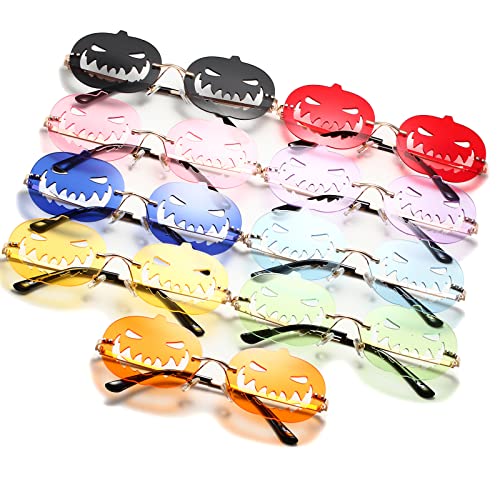 • 🎃 【UNIQUE PUMPKIN SUNGLASSES DESIGN】The Rimless Glasses is with the creative pumpkin design.The pumpkin sunglasses are the must-have accessory for Halloween cosplay party.Very lightweight metal frame and temples give you stress-free wearing experience. High quality polycarbonate lenses, comfortable silicone nose pads, reinforced metal hinges, all the details make it durable, shatterproof and fashionable.