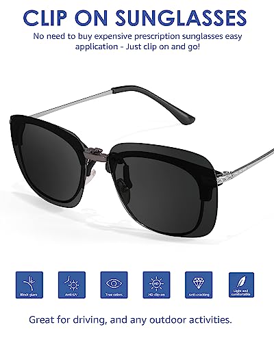 • COMPACT FIT DESIGN CLIP ON SUNGLASSES: You can easily clip these sunglasses onto your prescription eyeglasses, regardless of whether they have metal or plastic frames, are full-frame or rimless, This allows you to enjoy the benefits of sunglasses without having to purchase expensive prescription sunglasses. One-hand installation, just clips on and go.