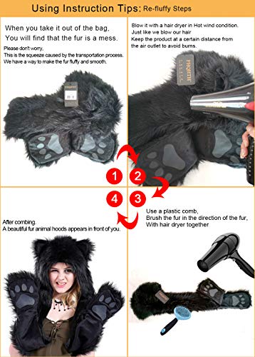 • SOFT MATERIAL: Faux Fur Fabric.. Material: 100% Polyester. Super warm faux fur animal hoods. Multi-function: Can be worn as scarf, hat or gloves paw mittens. Made with the softest faux fur available.