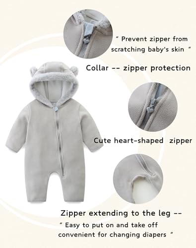 • 【Thoughtful Design】The bear ears on this jumpsuit make your baby look so lovely. Meanwhile, the full-zipper for easy dressing and diaper changes, and the collar features a small design to prevent zipper scratches. Fold-over mittens and footies, as well as hooded design, provide extra warmth for babies in cold weather. Free switching from indoor and outdoor , warm and adorable.