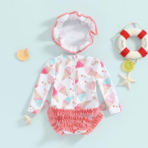 • Feature: Toddler baby girl one-piece swimsuit has long sleeve, mock neck,sun hat, checkerboard/ice cream/floral/bus print, ruffle trim, side tie-up, slim fit, basic length and back zipper closure