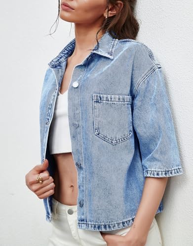 • Summer-Ready Denim Style:Stay cool in our women's summer denim shirt! Crafted with lightweight jean tops fabric, this button-down casual shirt features short sleeves and a relaxed fit, perfect for hot days.
