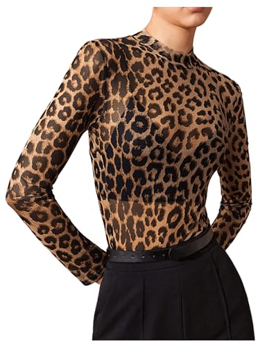 Floerns Women's Leopard Print Sheer Mesh Long Sleeve Tee Shirts Without Bra 4
