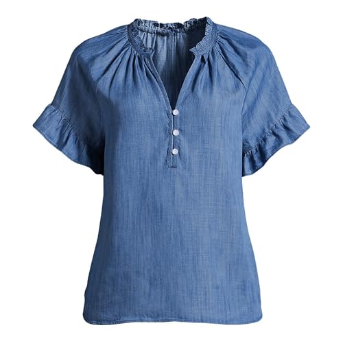 Womens Short Sleeve Ruffle Blouse V Neckline Ruffled Collar Shirt Casual Blue Top 1