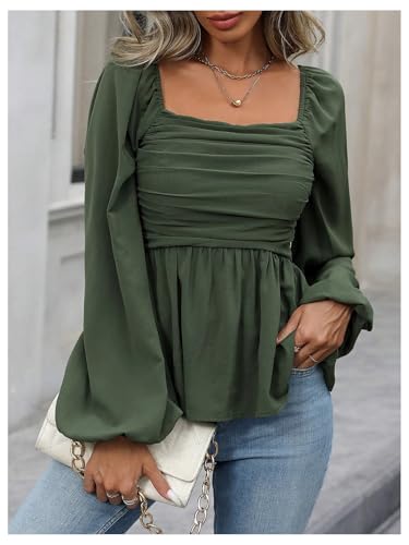 HOT ! Floerns Women's Bishop Long Sleeve Ruched Square Neck Ruffle Hem Peplum Blouse Top