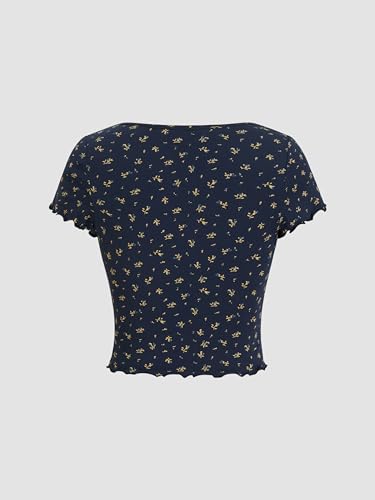 HOT ! CIDER Cute Top for Women Trendy 100% Cotton Pointelle Floral Short Sleeve Top Scoop Neck Lettuce Trim