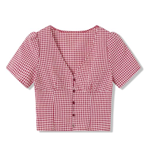 Y2k Button Up Shirt Women Short Sleeve Coquette Preppy Top Cute Vintage Button Down Slim Fitted Crop Gingham Blouse 5