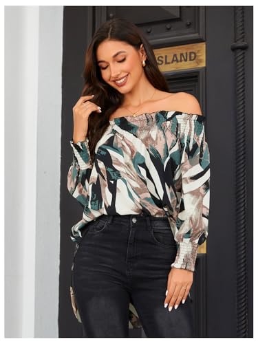 OYOANGLE Women's Off Shoulder High Low Tunic Tops Allover Print Long Puff Sleeve Blouse 6