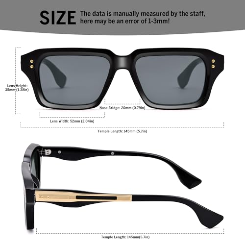 • Product Dimensions -- Lens Width: 52mm(2.04''), Lens Height: 35mm(1.38''), Temple Length: 145mm(5.7''), Nose Bridge: 20mm(0.79''), Frame Total Width: 145mm(5.7''). Attention: Manual measure, there may be 1-3mm error.