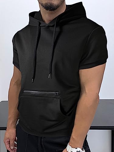 HOT ! SweatyRocks Men's Short Sleeve Drawstring Hooded Tee Top Zip Front Pullover T Shirt with Pocket