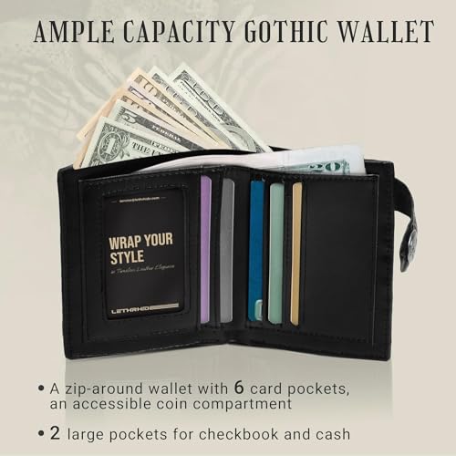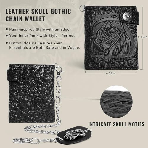 • ULTIMATE PUNK STYLE - Unleash your inner punk with our men's leather wallet, intricately carved with steam punk, gothic, and heavy metal embossed designs. It's a rugged grim reaper biker motif that's that fit for cool guys who love the edgy vibe. The included chain adds an extra touch of attitude.
