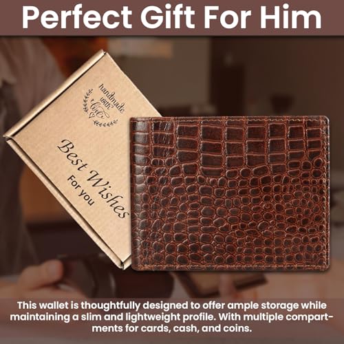 Men’s Leather Wallet RFID Blocking – Slim Bifold Wallet for Men with 15 Card Slots, ID Window – Stylish Crocodile Pattern, Durable Stitching, Brown – Gift Box Included 6