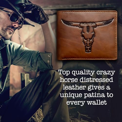 HOT ! Texas Longhorn Bifold Wallet - Western Wallet for Men -Longhorn Cowboy Wallet - RFID Blocking & 9 Card Slots - Distressed Leather Cowboy Wallet for Men
