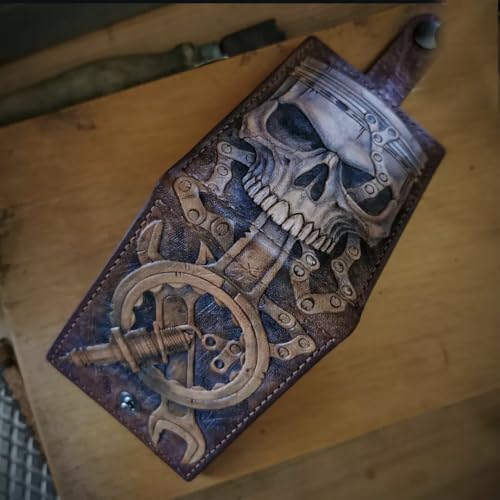 Men's 3D Genuine Leather Wallet, Hand-Carved, Hand-Painted, Leather Carving, Custom wallet, Personalized wallet, Skull, Gear Head Design, Wrench, Spanner, Skeleton, Bone, Biker, Spark Plug 3