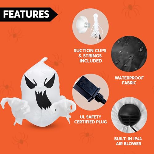 • Premium Quality UL Certified. This Halloween Inflatable Ghost is safe and easy to set up, plug in, then everything pop-up right away. This Halloween yard decoration is made of high-quality waterproof fabric. Not easily torn. The excellent suture keeps it inflated all the time. So even if it is inflated for a long time, there will be no air leakage.