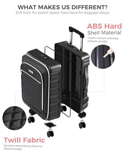 • INNOVATIVE HYBRID DESIGN: This carry on suitcase blends flexibility and protection with a scratch-resistant fabric front and a tough ABS hardshell back, giving you quick access to essentials and secure storage for every journey