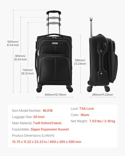 More information about VEVOR Softside Expandable Luggage with Spinner Wheels, 20-Inch Softside Carry on Luggage, Lightweight Checked Suitcase with Expandable Zippered Pocket and TSA Lock, Black
