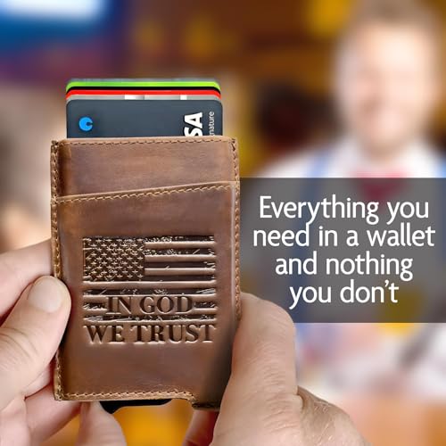 HOT ! Minimalist Pop Up Wallet for Men - Leather Push Button Wallet - Patriotic Design - IN GOD WE TRUST - Card Ejector Wallet - RFID Blocking - Front Pocket Wallet