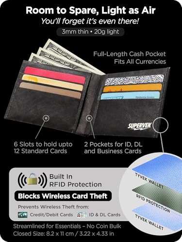 • Ultra-thin yet Incredibly Strong: Super Classic wallets are crafted from HDPE sheets with millions of non-woven fibers, making them incredibly mighty strong, durable, and ultra-thin. This slim paper wallet keeps you organized on the go with 6 slots to hold up to 12 cards, 2 pockets for ID/business cards, and 2 large pockets for cash and bills. This wallet for men and women promises both practicality and a chance to show off your personal flair! billetera para hombre